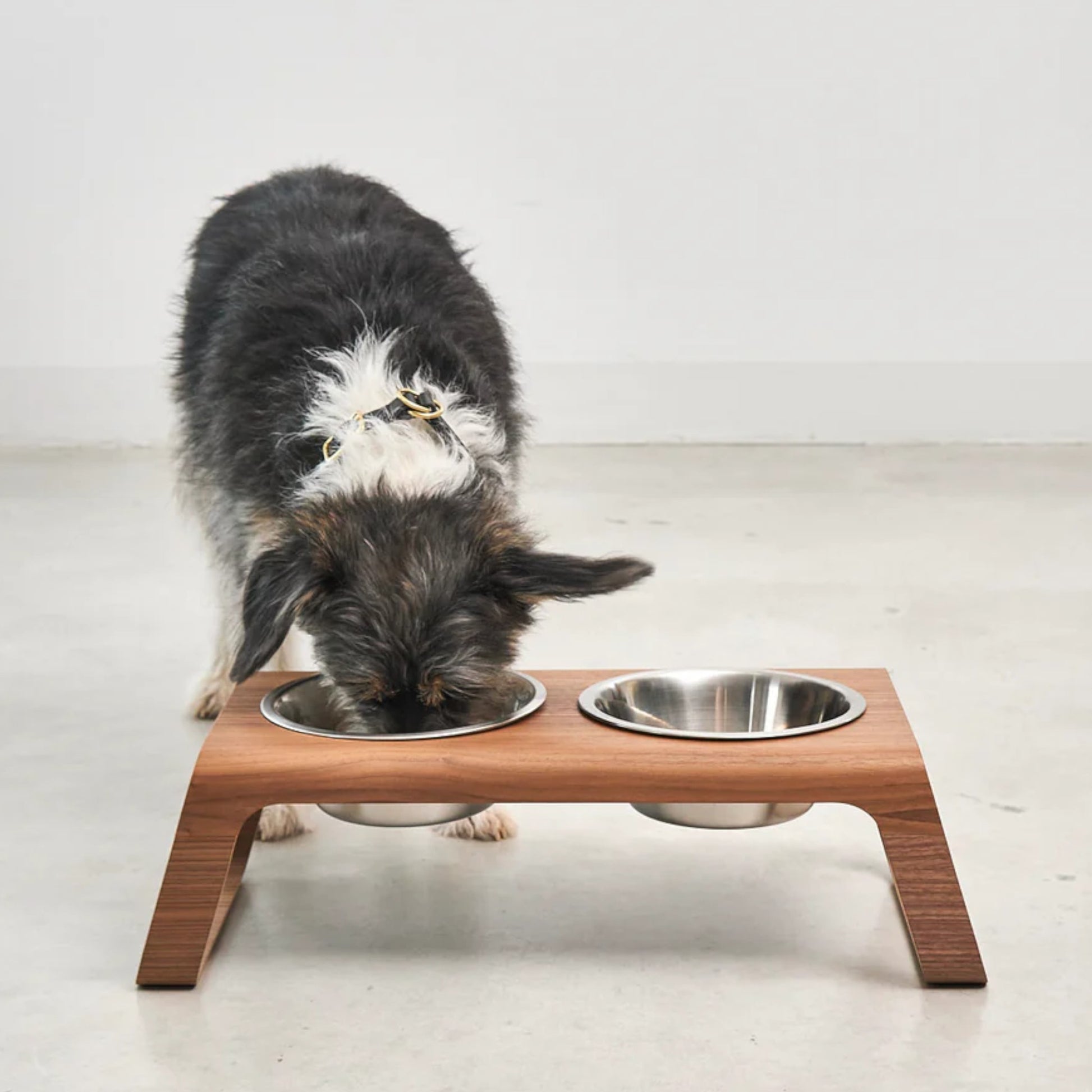 Un comedero elevado que celebra la estética natural del hogar compartido. Con cuerpo de madera curvada y cuencos de acero inoxidable, combina diseño y bienestar con una belleza sencilla y duradera.