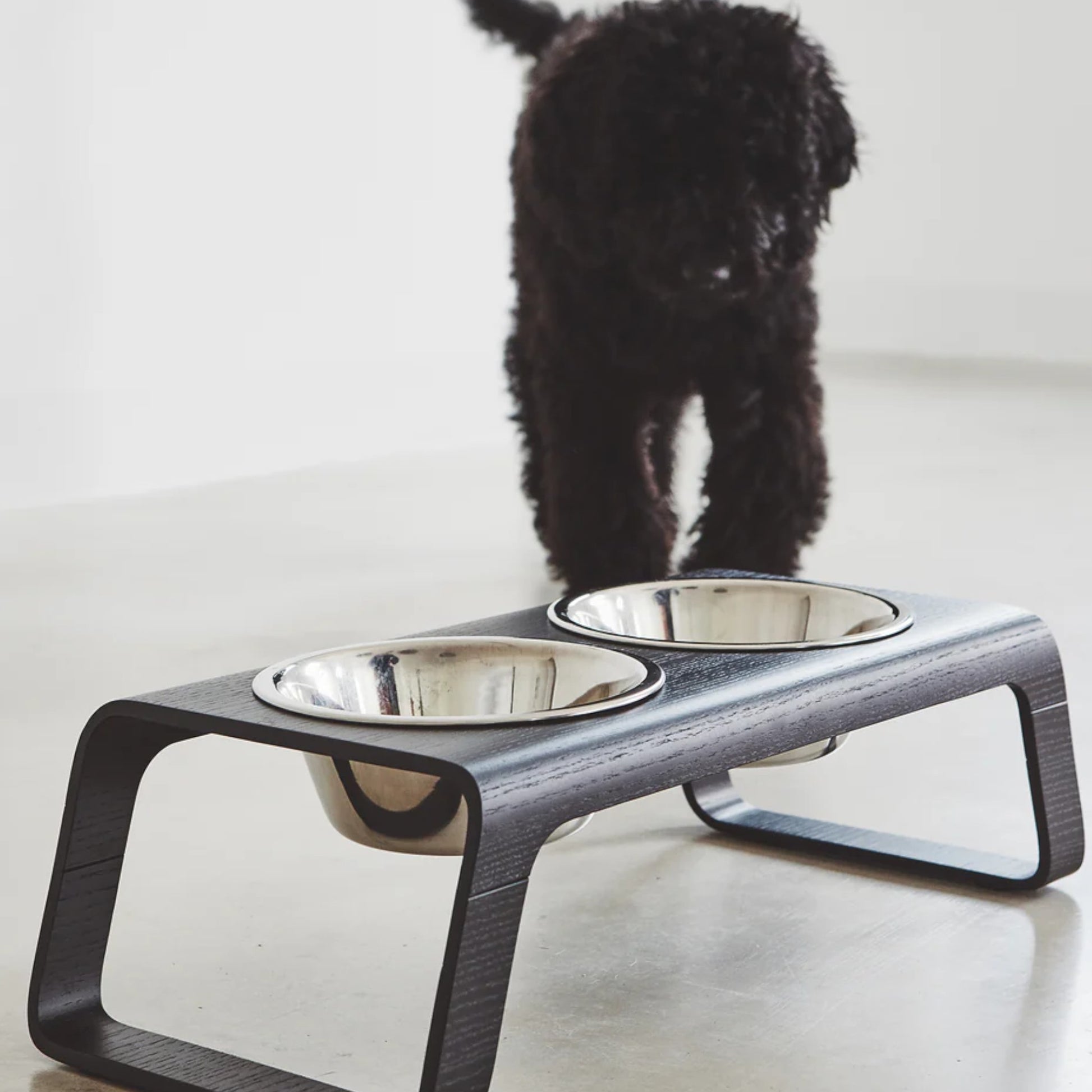 Fabricado en madera contrachapada moldeada y disponible en tres acabados sobrios (nogal, fresno natural o fresno teñido en negro), este comedero es tan resistente como elegante. Sus cuencos de acero inoxidable —aptos para lavavajillas— se mantienen firmes gracias a anillos de silicona, mientras que los pies antideslizantes evitan movimientos molestos durante la comida. Ideal para hogares donde cada detalle cuenta.