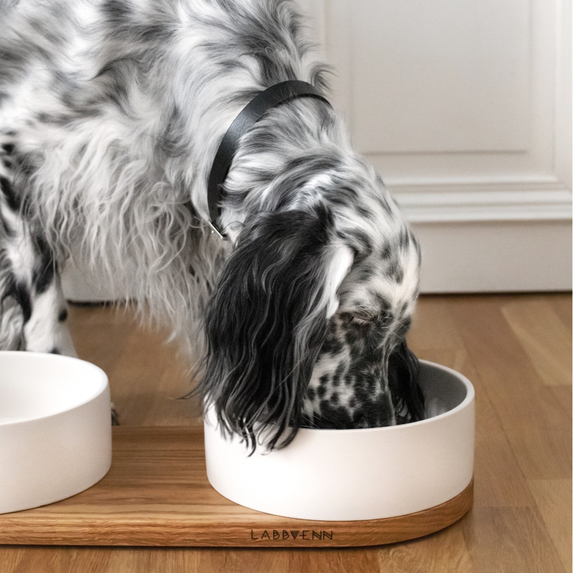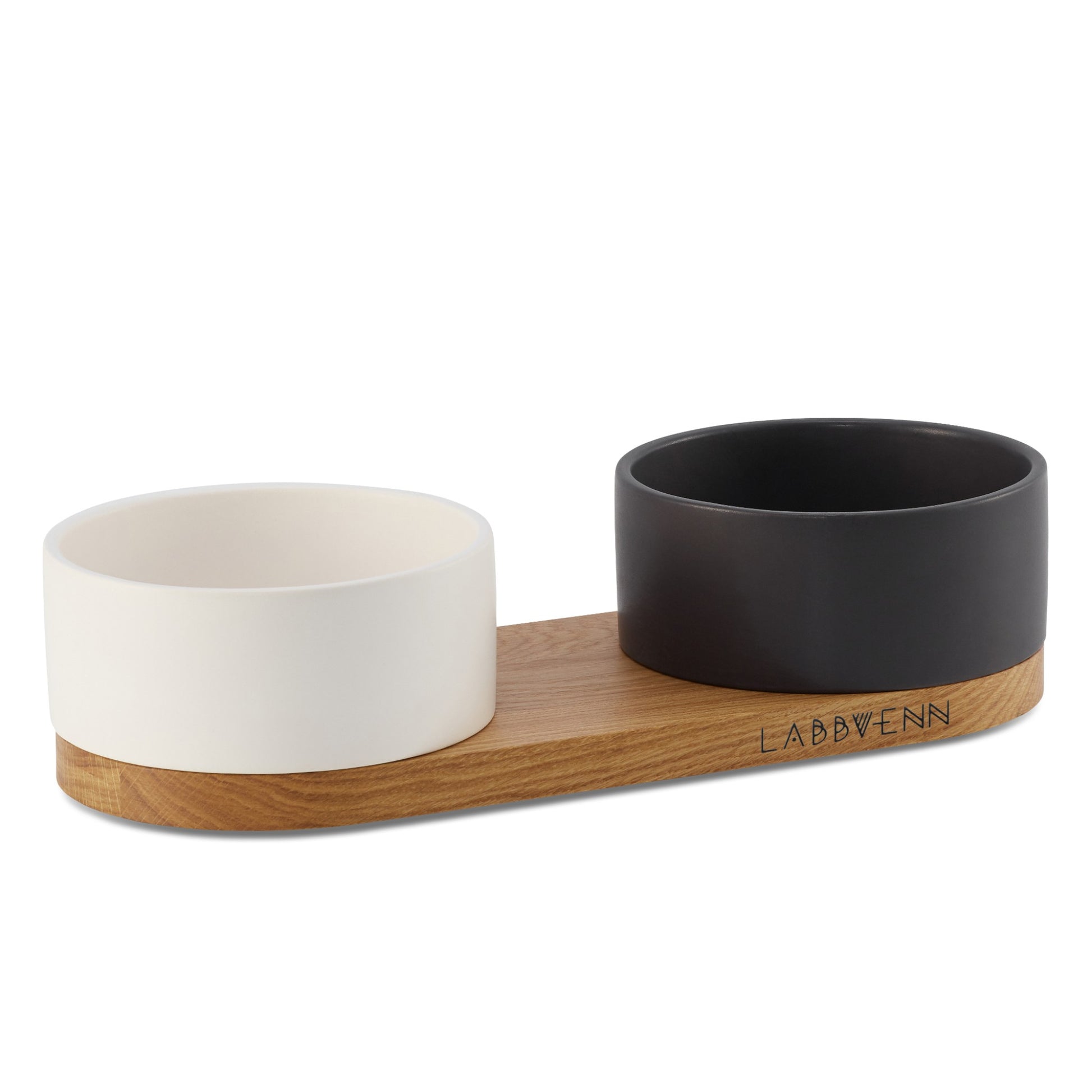 Su base de roble natural, tratada con tres capas de protección, aporta estabilidad y calidez. Los dos cuencos de cerámica artesanal, de formas redondeadas y acabado mate, garantizan una experiencia higiénica y estilísticamente impecable. La combinación de estos materiales crea un objeto útil, sobrio y atemporal, pensado para convivir con elegancia en cualquier rincón de casa.